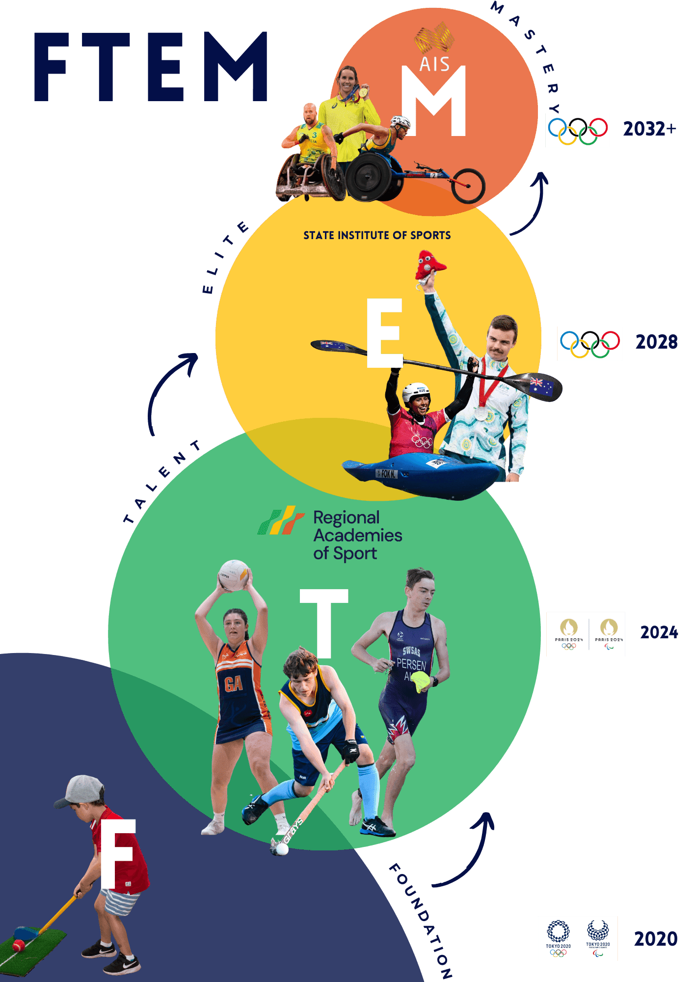 Australian sports have embraced the F.T.E.M. model to define high-performance pathways. The model emphasizes the stages of Foundation, Talent, Elite, and Mastery, serving as a guiding framework for athlete development.